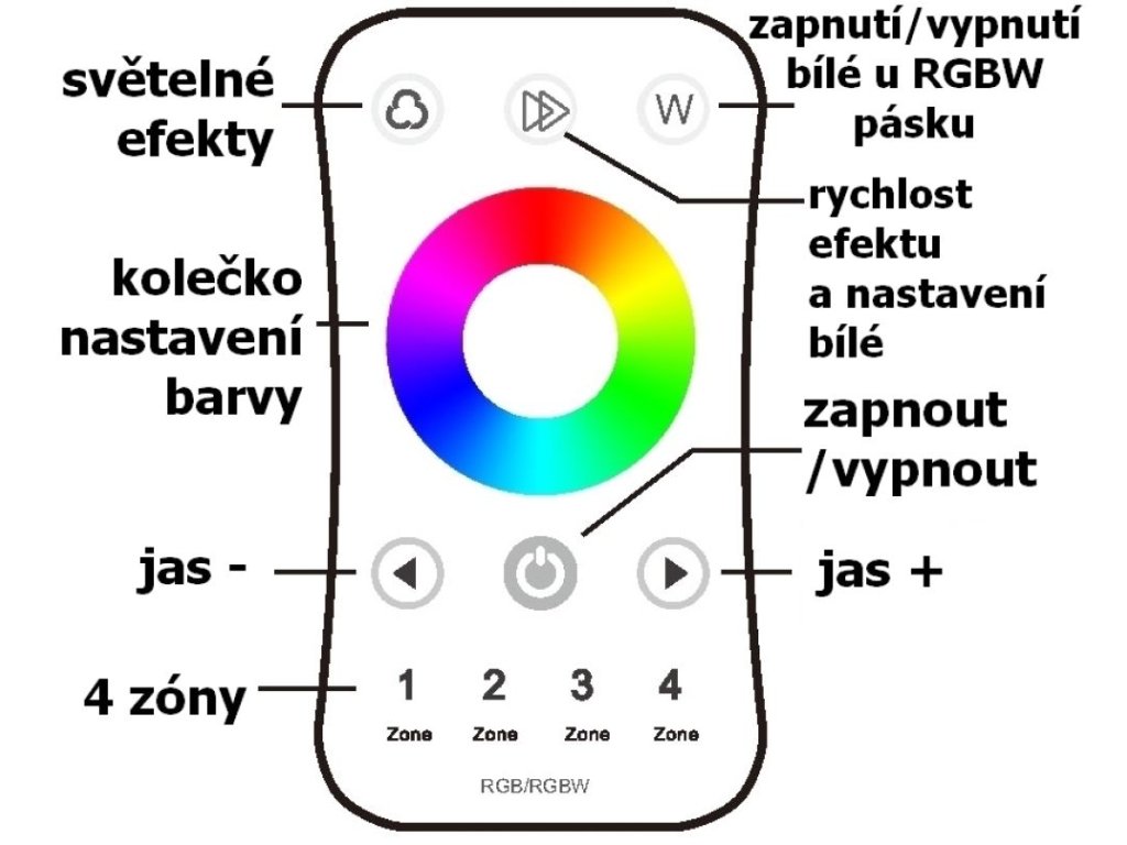 Ovladač lze použít pro RGB pásky s přijímačem RGB nebo pro RGBW pásky s RGBW přijímačem.
